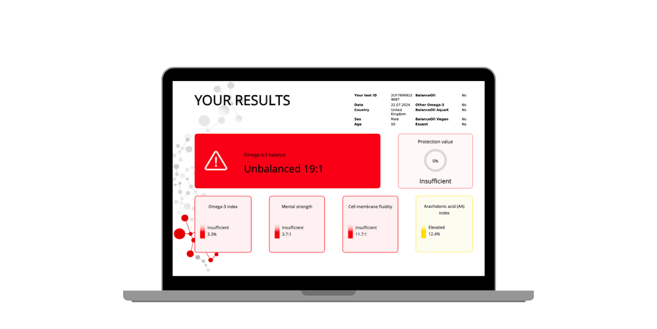 The Omega Balance Test Kit is a simple, accurate finger-prick blood test that provides a detailed analysis of your omega-3 and omega-6 ratios. Tailor your nutrition based on real data, and take control of your health by understanding your body's fatty acid balance, helping you reduce inflammation and improve overall well-being.